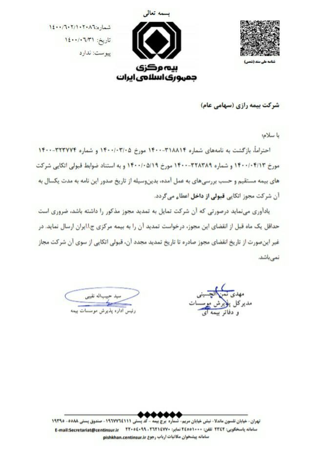 بر اساس این گزارش ، بیمه مرکزی به استناد ضوابط قبولی اتکایی شرکت های بیمه مستقیم و پس از بررسی های شرایط موجود این مجوز را به بیمه رازی ارائه کرد.