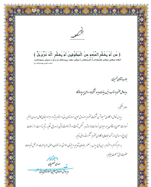 به پاس تعامل و همکاری صمیمانه آن شرکت محترم با صندوق تأمین خسارت های بدنی و اهتمام ویژه در اجرا و ایفای کامل و بدون تأخیر تعهدات مصرح در قانون بیمه اجباری خسارات وارد شده به شخص ثالث در اثر حوادث ناشی از وسایل نقلیه شایسته است از زحمات بی دریغ و مساعی ارزشمند جنابعالی و همکاران محترم تشکر و قدردانی نماییم.