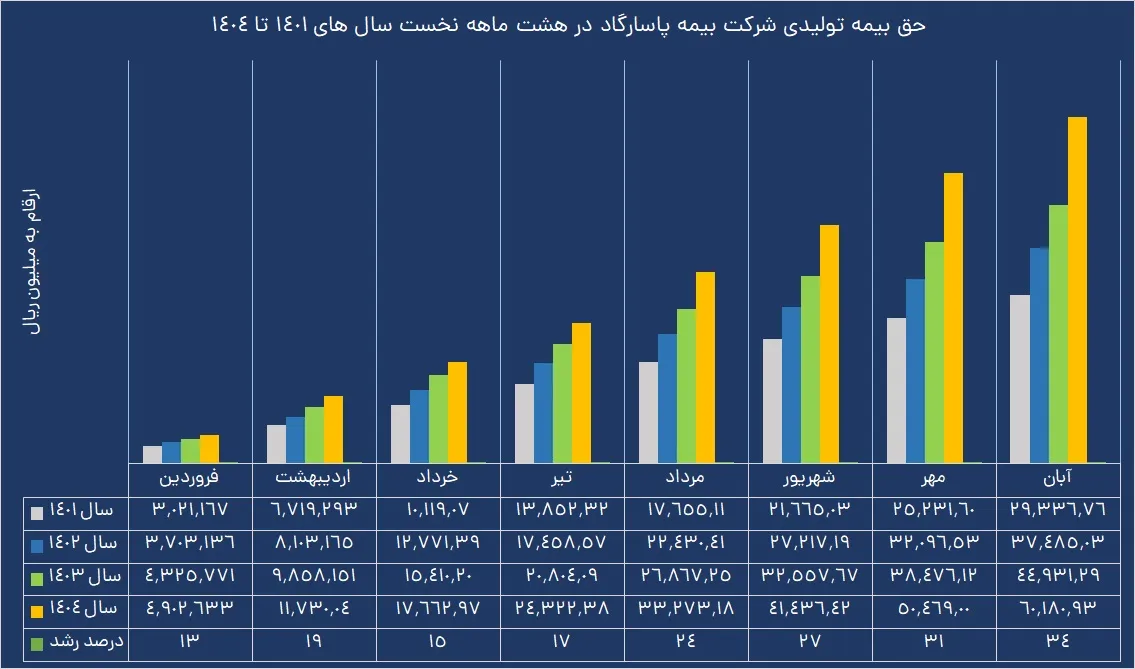 مرور عملکرد سالهای ۱۴۰۱ تا ۱۴۰۴ نشان میدهد که اگرچه این رشته همواره در مسیر رشد بوده، اما سال ۱۴۰۴ نقطه اوج این روند است. در فروردین ۱۴۰۱، حقبیمه تولیدی حدود ۳ میلیون و ۲۱ هزار و ۱۶۷ میلیون ریال بود و در فروردین ۱۴۰۲ این رقم به ۳ میلیون و ۷۰۳ هزار و ۱۳۶ میلیون ریال رسید و رشدی حدود ۲۲ درصد ثبت شد. سال بعد نیز فروردین ۱۴۰۳ با ثبت ۴ میلیون و ۳۲۵ هزار و ۷۷۱ میلیون ریال، رشد نزدیک به ۱۶ درصدی را تجربه کرد. این روند در فروردین ۱۴۰۴ با رقم ۴ میلیون و ۹۰۲ هزار و ۶۳۳ میلیون ریال ادامه یافت و رشدی بیش از ۱۳ درصد را رقم زد.