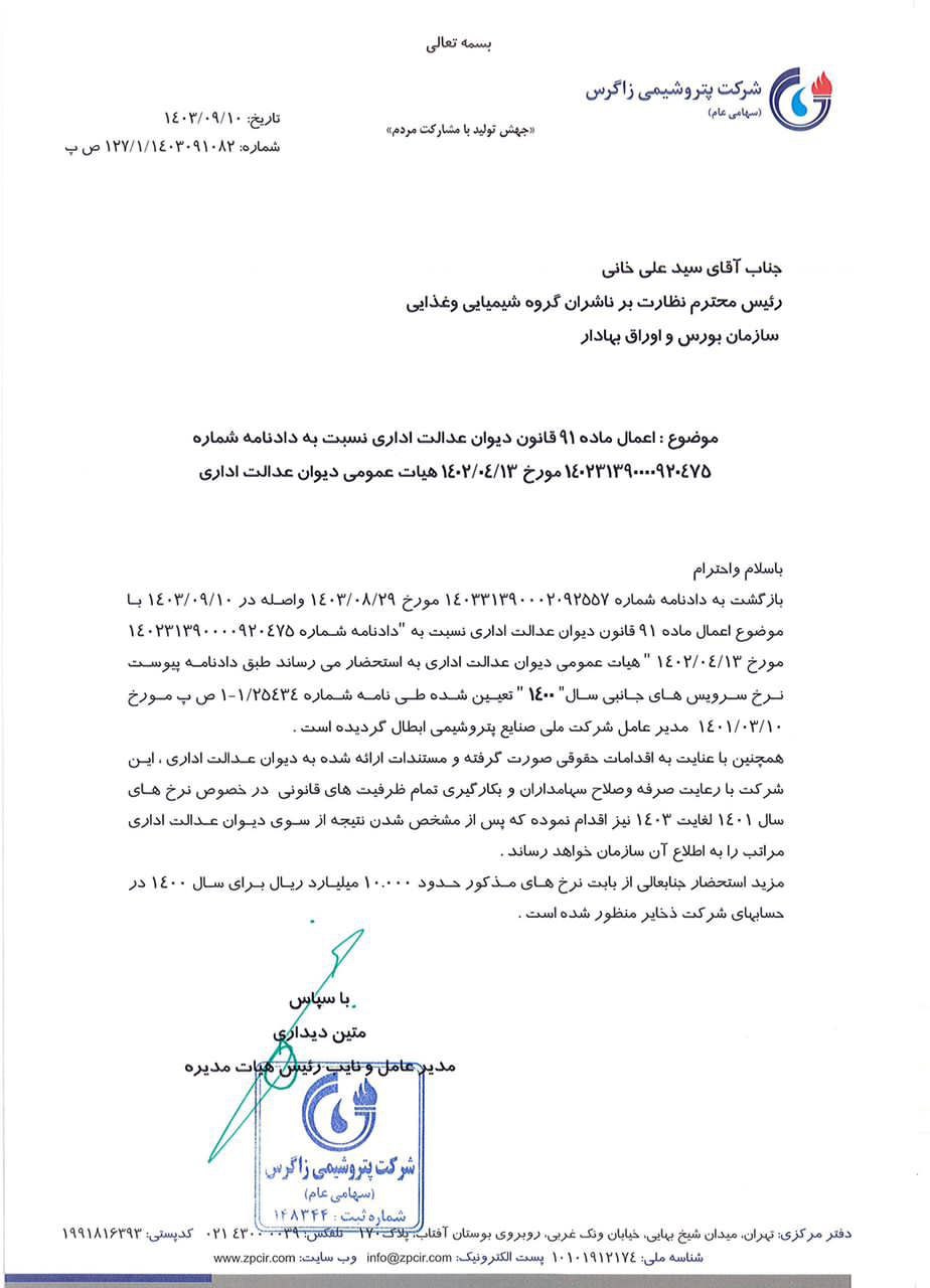 درآمد نیوز -شرکت ملی صنایع پتروشیمی در طی نامه ای در خردادماه ۱۴۰۱ نرخ نامه عجیب و غریبی را در خصوص سرویس های جانبی به شرکت های مصرف کننده ابلاغ کرد با توجه به اینکه شرکت پتروشیمی زاگرس یکی از اصلی ترین شرکت های مصرف کننده سرویس های جانبی بود به منظور احقاق حقوق سهامداران ضمن عدم پذیرش نرخ نامه شکایتی را در هیات عمومی دیوان عدالت اداری ثبت کرد و درایت مقام عالی قوه قضاییه و ریاست هیات عمومی دیوان عدالت اداری در پذیرش ماده ۹۱ ، این نرخ نامه ابطال شد و از حقوق بازنشستگان نیروی مسلح و بازنشستگان کشوری با پیگیری های مجدانه دکتر متین دیداری صیانت شد و خبر آن در هفته های گذشته در رسانه ها درج شد و امروز بعد از ابلاغ رسمی از طرف رییس هیات عمومی دیوان عدالت اداری شرکت پتروشیمی زاگرس به صورت رسمی این خبر مسرت بخش را در کدال تقدیم به سهامداران خود کرد و نوید روزهای خوب برای شرکت پتروشیمی زاگرس را در آینده ای نزدیک داد./
