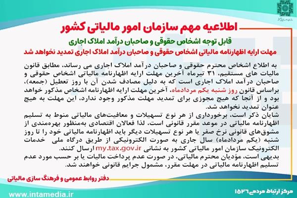 به گزارش درآمد نیوز و به نقل از روابط عمومی سازمان امور مالیاتی ، به اطلاع اشخاص محترم حقوقی و صاحبان درآمد املاک اجاری می رساند، مطابق قانون مالیات های مستقیم، ۳۱ تیرماه آخرین مهلت ارایه اظهارنامه مالیاتی اشخاص حقوقی و صاحبان درآمد املاک اجاری است که به دلیل مصادف شدن آن با روز تعطیل (جمعه)، براساس قانون روز شنبه یکم مردادماه، آخرین مهلت ارایه اظهارنامه اشخاص مذکور خواهد بود و از آنجا که هیچ مجوزی برای تمدید مهلت مذکور وجود ندارد، این مهلت به هیچ عنوان تمدید نخواهد شد.