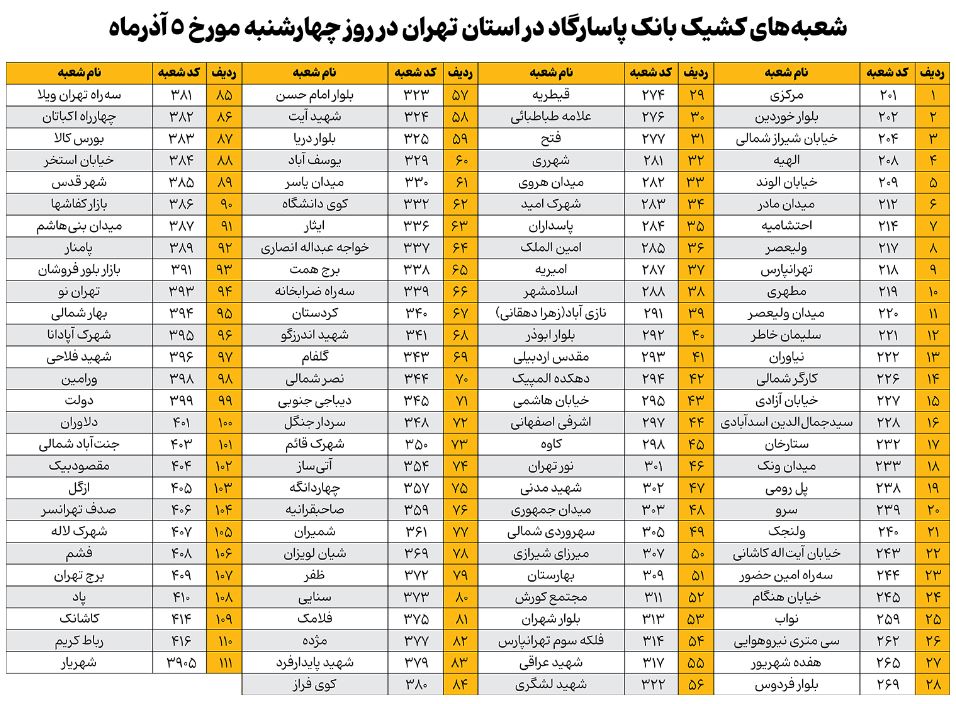 به اطلاع مشتریان ارجمند میرساند، با توجه به تداوم آلودگی هوا و بر اساس تصمیم استانداری تهران و ابلاغیه کانون بانکها و مؤسسات اعتباری خصوصی، ارائه خدمات به مشتریان گرامی در روز چهارشنبه، ۵ آذرماه ۱۴۰۴، از طریق شعبههای کشیک و در بازه زمانی ۷:۳۰ الی ۱۳:۳۰ انجام خواهد شد. بدینوسیله فهرست شعبههای کشیک بانک پاسارگاد در استان تهران به شرح زیر اعلام میگردد.